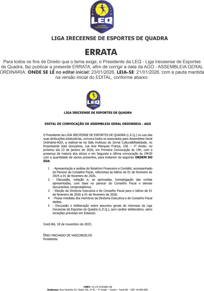 ERRATA: LEQ – LIGRA IRECEENSE DE ESPORTES DE QUADRA