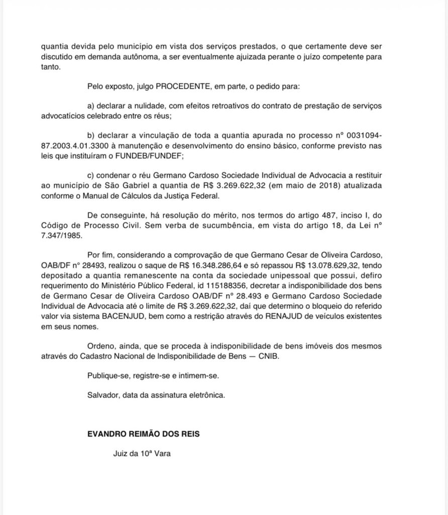A sentença anexada à nota, proferida pelo juiz federal Evandro Reimão dos Reis, declarou nulo o contrato firmado entre o escritório e o Município e determinou que o advogado Germano Cesar de Oliveira Cardoso, bem como sua sociedade de advocacia, devolvam R$ 3.269.622,32 aos cofres de São Gabriel, montante correspondente ao valor apropriado indevidamente. A decisão também determinou a indisponibilidade de bens, o bloqueio de contas bancárias e a restrição de veículos, como forma de garantir o ressarcimento integral.
