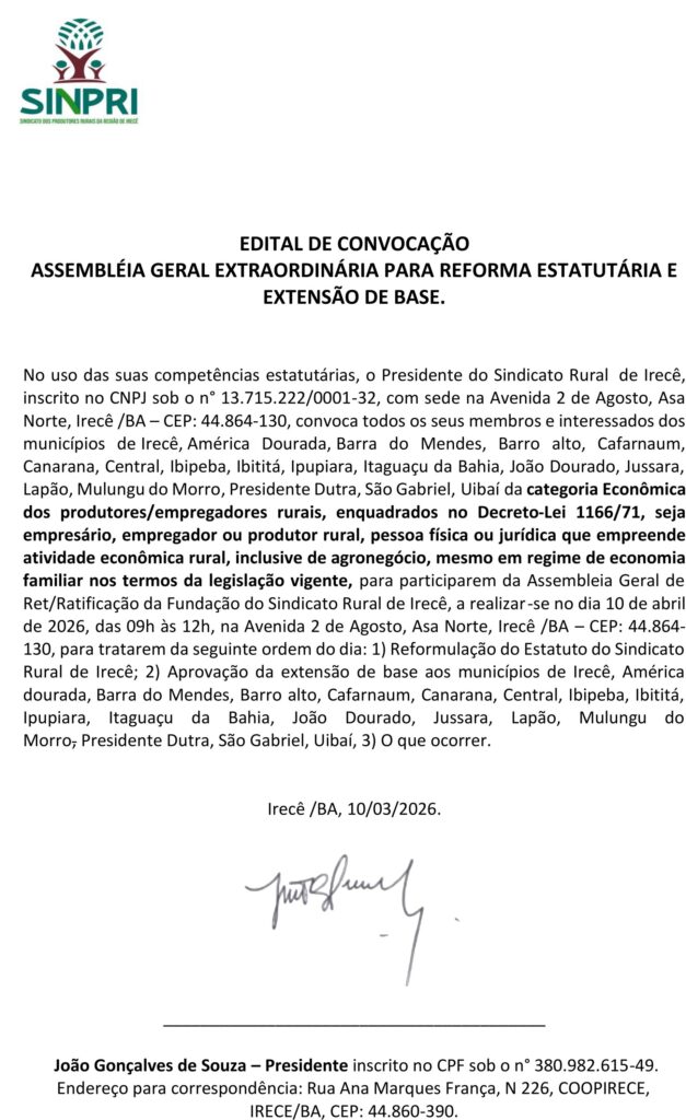 SINDICATO RURAL DE IRECÊ CONVOCA ASSEMBLEIA GERAL EXTRAORDINÁRIA – AGE